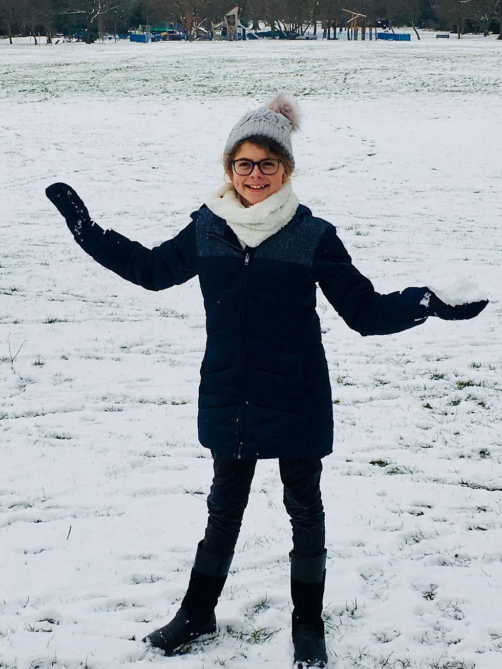 En décryptage de maman, cela signifie, vingt minutes d'emmitouflage, sortie des affaires de ski, écharpe et sous-pull de compétition, et puis ensuite nez rougi, mains gelées, bottines détrempées, mais bon, comment résister à l'appel du grand blanc ? Même mon âme d'enfant me titille déjà : allez, dehors ! Après tout, j'ai suffisamment regardé les JO de Pyeongchang à la télé avec toute cette neige par procuration, pour ne pas m'offrir moi aussi, une virée au grand froid ! Vite mes collants, on arriiiiive.... Cinq minutes plus tard, couvertes comme des laponnes (nous en vraies niçoises, le froid, il n'y a pas à dire, on ne s'y habitue jamais !), nous voilà donc marquant de nos empreintes les trottoirs immaculés. Cap sur le Lammas Parc situé à quelques encablures du domicile.